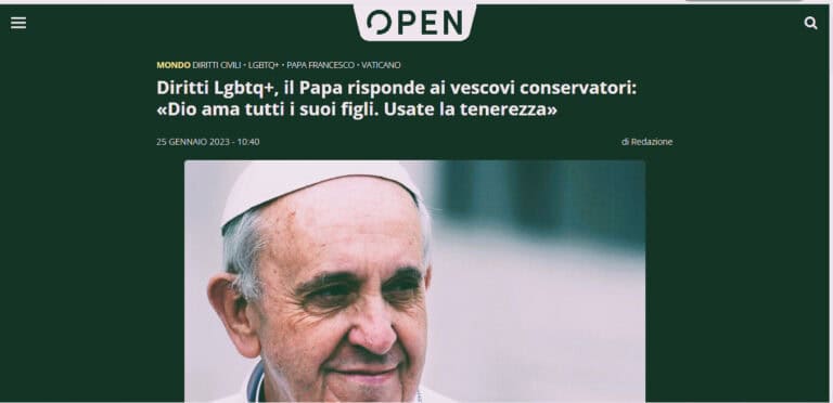 Parlandone, sin dal titolo del pezzo poi pubblicato, Open ha riferito di una “risposta” del Papa in tema di omosessualità: “Diritti Lgbtqi+, il Papa risponde ai vescovi conservatori: «Dio ama tutti i suoi figli. Usate la tenerezza»”.
