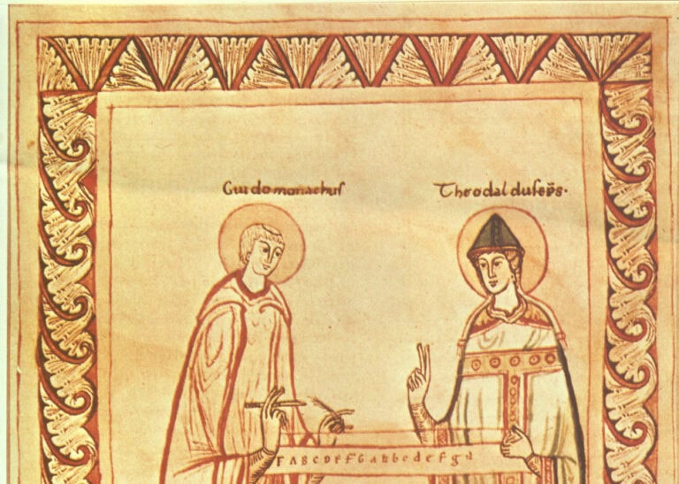 Guido d’Arezzo e il vescovo Teodaldo in una miniatura del XII secolo.