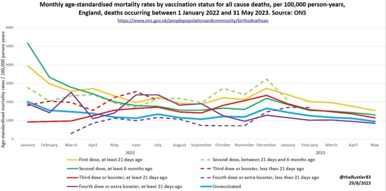 Ovvero dopo che l’Office of National Statistics ha corretto i dati pubblicando i dati consolidati ufficiali risulta evidente che chi si è vaccinato mRNA contro la Covid-19 ha maggiore rischio di morire per tutte le cause rispetto a chi non si è NON vaccinato.