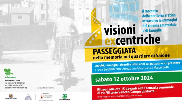 La passeggiata, che si sviluppa in un percorso affascinante in cui molto ancora esiste ma molto è andato perduto, trasformando i partecipanti in spettatori attivi nella visione reale e mnemonica di un quartiere in continua trasformazione, si svolge nell’ambito del progetto Visioni Ex-centriche che vede uniti Officine della Cultura e Liceo Artistico Coreutico Scientifico Quadriennale “Piero della Francesca” di Arezzo nel racconto della periferia aretina attraverso le immagini del cinema amatoriale e di famiglia. L’iniziativa è realizzata con il contributo di Fondazione CR Firenze nell’ambito del Bando “Partecipazione culturale 2023”.