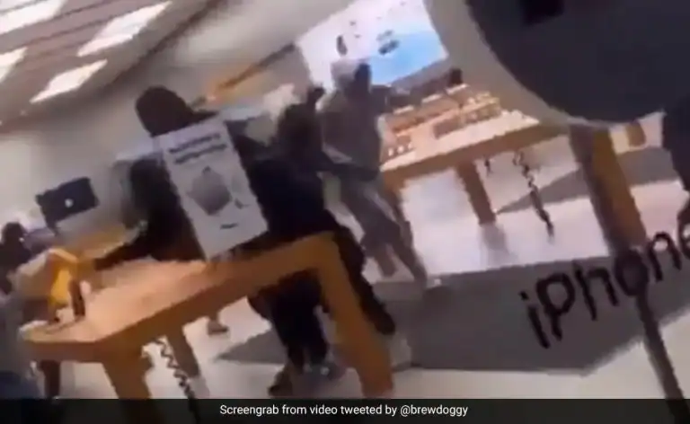 Il video girato davanti ad un Apple Store mostra iPhone e iPad sparsi sui tavoli saccheggiati da giovani ragazzi per lo piu’ bendati.