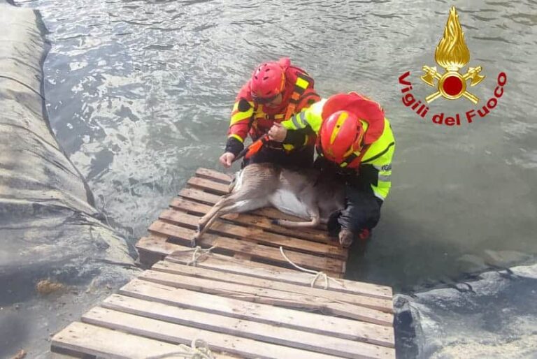Un piccolo daino di circa 50 kg era finito in acqua all’interno di un laghetto artificiale e non riusciva ad uscire.