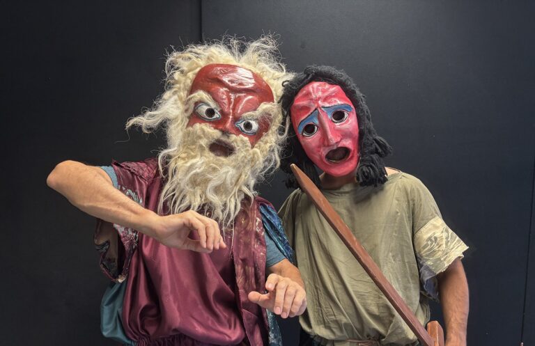 Le maschere utilizzate si rifanno ai modelli originali ritrovati nella necropoli di Lipari. A loro spetta il ruolo di creare l’imprevisto effetto comico dovuto alla loro complementarietà rispetto alla parola.