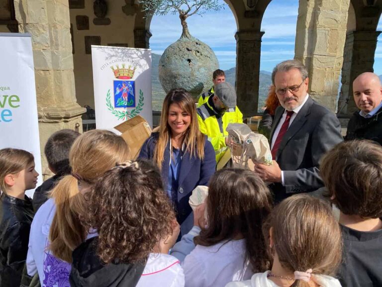 Cento borracce in acciaio inox sono state consegnate stamani, in Piazza del Comune, dal sindaco di Castiglion Fiorentino Mario Agnelli, dall’Assessore con delega all’Ambiente Francesca Sebastiani e dal presidente di Nuove Acque Carlo Polci ad altrettanti studenti di quinta elementare dell’Istituto Comprensivo Città di Castiglion Fiorentino, nell’ambito del programma “Plastic Free” 2024-2025.