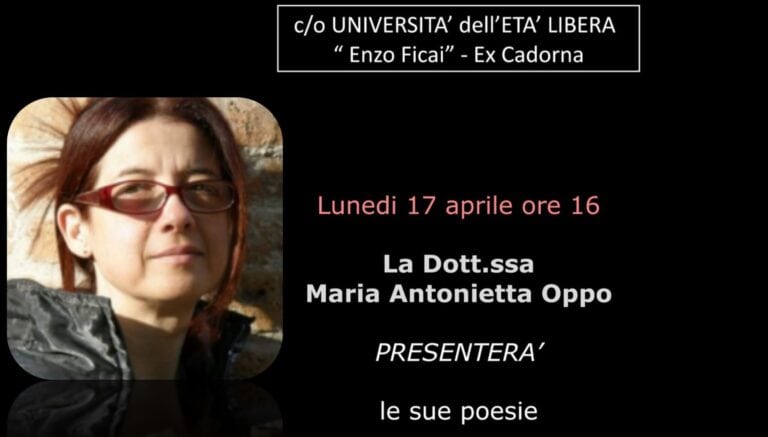 Lunedì 17 aprile 2023 con inizio alle ore 16.00 ed ingresso libero e gratuito presso l’Università dell’Età Libera “Enzo Ficai” di Arezzo, la dr.ssa Maria Antonietta Oppo presenterà le sue poesie accompagnata al pianoforte dal Maestro Alessandro Cinelli.