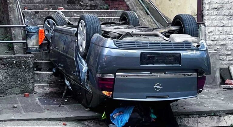 Un’auto è uscita di strada ed ha capitombolato giù per tutta una scalinata finendo per cappottarsi.