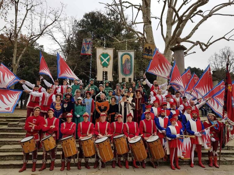 I gruppi andranno a formare una compagine da record di oltre 150 figuranti, composta anche dai rioni faentini e da una rappresentanza del Quartiere di Porta Sant’Andrea, che alle 15 circa lascerà la sede del Rione Rosso per dirigersi verso Piazza del Popolo, la piazza principale di Faenza, dove si esibiranno prima singolarmente e poi in un unico momento collettivo. Ogni gruppo avrà infatti disposizione qualche minuto a disposizione per dare esempio della propria scuola dopo di che tutti i figuranti si riuniranno nella cornice di Piazza del Popolo. La delegazione aretina sarà composta di tredici figuranti in costume, assieme a dirigenti e quartieristi,