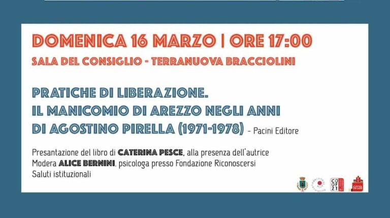 Domenica 16 marzo alle ore 17.00, nella sala del consiglio di Terranuova Bracciolini, si terrà la presentazione del libro “Pratiche di Liberazione. Il manicomio di Arezzo negli anni di Agostino Pirella (1971-1978)”, un’opera che ripercorre il processo di smantellamento dell’ospedale psichiatrico di Arezzo, uno dei momenti più significativi della Riforma Psichiatrica in Italia.