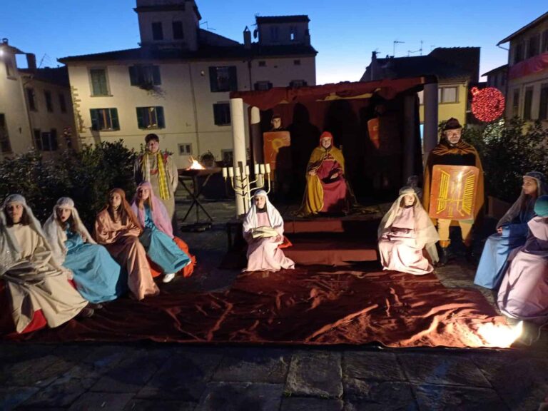 Il โcamminoโ verso la Nativitร รจ iniziato da Porta Fiorentina per salire verso piazza San Francesco dove รจ stato allestito lโaccampamento militare romano con i centurioni a cavallo e lโarea Giudea con i sommi sacerdoti e la reggia di Erode.