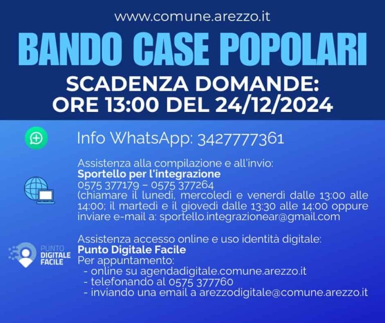 Tutte le informazioni, con il link per accedere alla procedura, sono su https://www.comune.arezzo.it/bando-formazione-della-graduatoria-lassegnazione-alloggi-edilizia-residenziale-pubblica-erp-1