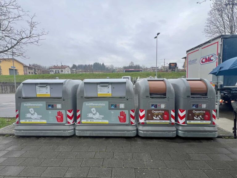 organico (marrone); vetro (verde); multimateriale (plastica, alluminio, tetrapak – giallo) e residuo non riciclabile (grigio).
