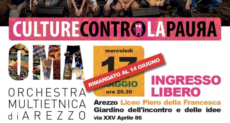 Si informa che è stato deciso di rimandare a mercoledì 14 giugno il concerto dell’Orchestra Multietnica di Arezzo previsto per questa sera, mercoledì 17 maggio, presso il Giardino dell’incontro e delle idee del Liceo Piero della Francesca in Via XXV Aprile 86.