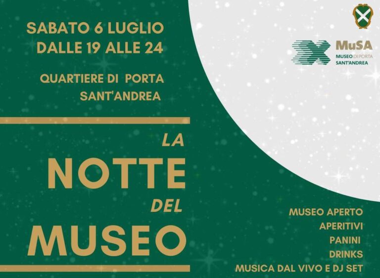 Sabato 6 luglio è in programma “la Notte del Museo” al Quartiere di Porta Sant’Andrea: dalle 19 alle 24 il Museo del Quartiere (ingresso da via Garibaldi 15) sarà aperto a ingresso gratuito mentre nella corte si terrà una degustazione di vini al calice, aperitivi, drink a partire dalle 19 e sarà possibile mangiare con panini alla piastra e patatine fritte.