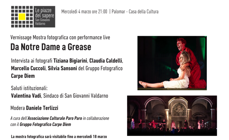Una serata capace di unire racconto, spettacolo e partecipazione, quella in programma mercoledì 4 marzo alle 21 a Palomar – Casa della cultura, dove si terrà il vernissage della mostra fotografica “Da Notre Dame a Grease”.