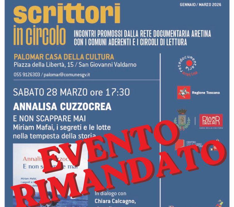 È stato rinviato a data da destinarsi l’incontro con la giornalista e scrittrice Annalisa Cuzzocrea, in programma sabato 28 marzo alle 17,30 a Palomar – Casa della Cultura di San Giovanni Valdarno, nell’ambito della rassegna “Scrittori in Circolo” promossa dalla Rete Documentaria Aretina.