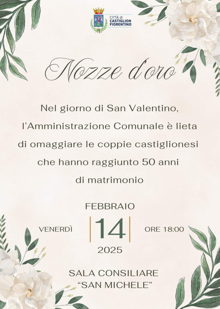 Il Sindaco Mario Agnelli saluterà le cittadine e i cittadini che hanno raggiunto questo traguardo tanto importante proprio il giorno di San Valentino, venerdì 14 febbraio alle ore 18.00, presso la Sala San Michele, Palazzo Comunale. Oltre 40 le coppie che lo scorso anno hanno celebrato le Nozze d’Oro e che in questi giorni hanno ricevuto l’invito a partecipare alla cerimonia tanto semplice quanto sentita.