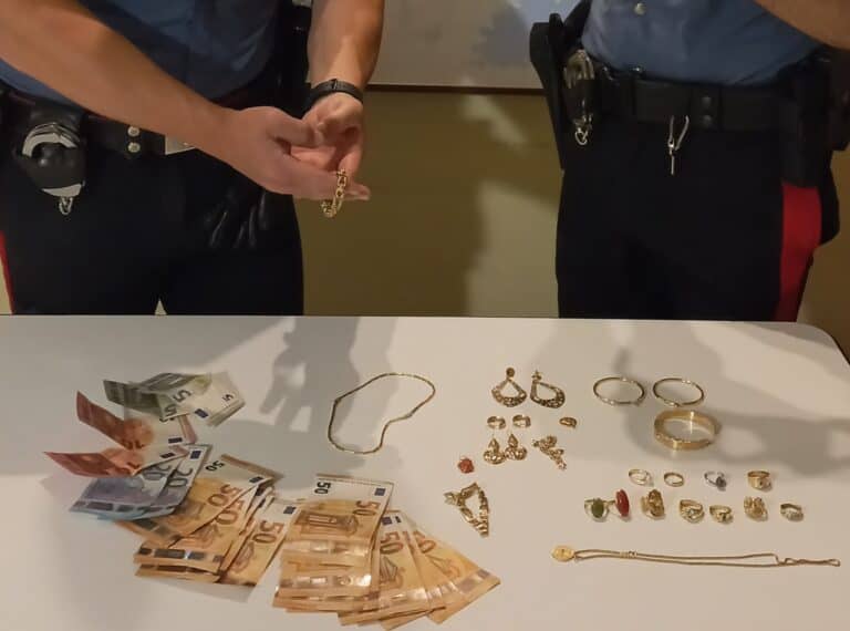 Gioielli in oro per un peso complessivo di 187 gr. ed un controvalore di circa 11.000 € oltre alla somma di 700 € in contanti in banconote di vario taglio.