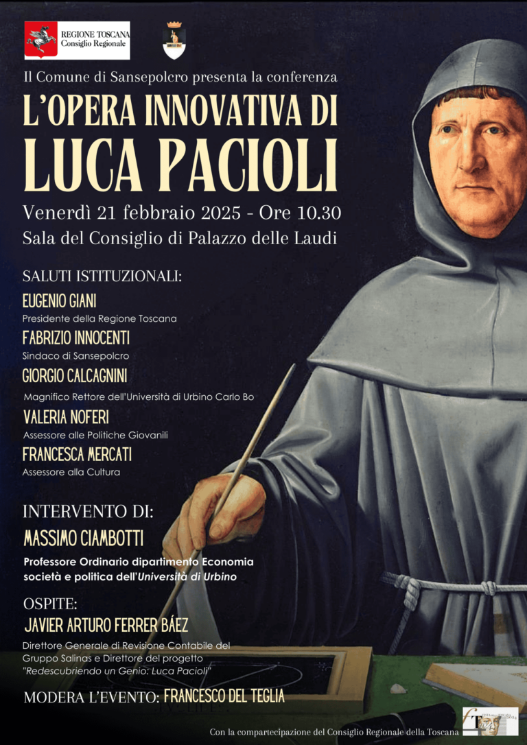 Ospite d’eccezione della conferenza sarà Javier Arturo Ferrer Báez, Direttore Generale di Revisione Contabile del Gruppo Salinas e responsabile del progetto internazionale “Redescubriendo un Genio: Luca Pacioli”, che si propone di riscoprire e valorizzare la figura del matematico biturgense su scala globale.
