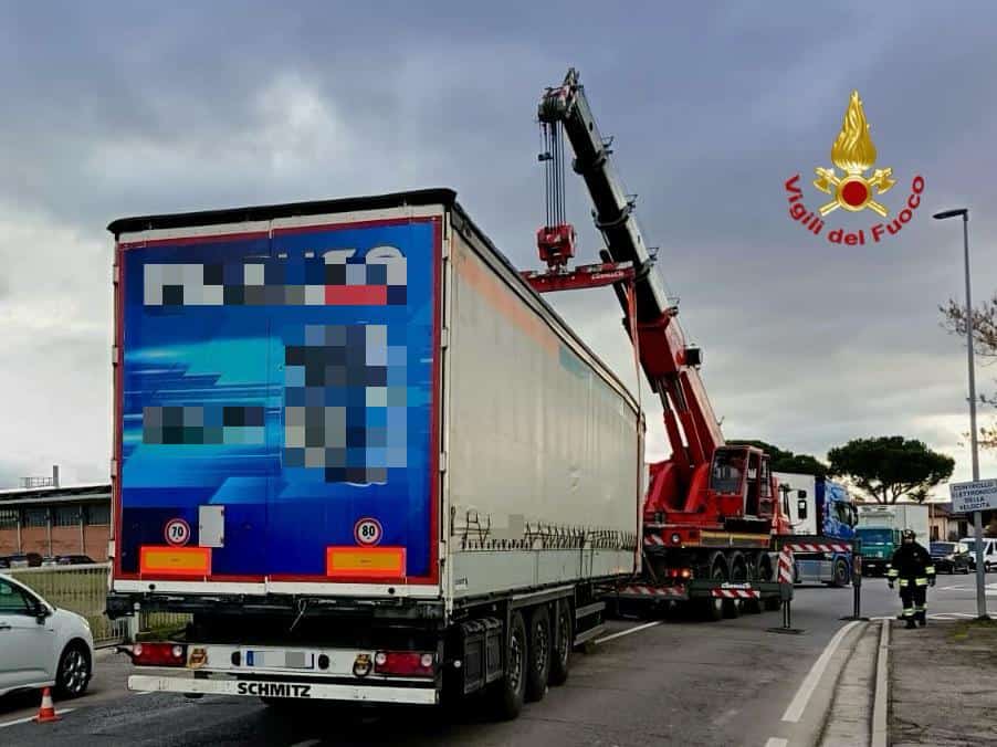 Per consentire la rimozione del mezzo e il ripristino della viabilità, i Vigili del Fuoco sono intervenuti anche con una autogrù, grazie alla quale il semirimorchio è stato sollevato e riagganciato a un trattore stradale. L’operazione ha permesso di liberare la strada e riaprire la circolazione veicolare in sicurezza.