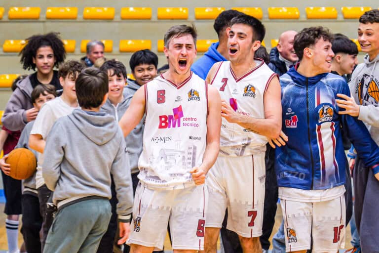 I minuti scorrono veloci con i ragazzi di coach Fioravanti che mantengono il vantaggio avvicinandosi alla sirena finale, ma i tifosi amaranto si alzano in piedi quando il capitano Facundo Toia esce dal campo a 1 minuto e 51 secondi dalla sirena e si prende la standing ovation prolungata per tributare il saluto ad un giocatore arrivato in punta di piedi ma che ha saputo conquistare il cuore del pubblico aretino con le sue giocate.