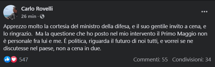 Il ministro Guido Crosetto ha tenuto a precisare con un cinguettio: “Inviterò a pranzo il Professor Rovelli così la prossima volta che parlerà di me lo farà avendo conosciuto me, le mie idee, sapendo cosa ho fatto e faccio ogni giorno per cercare la pace e fermare la guerra ed anche per sentire come si serve una nazione con serietà e rispetto“.