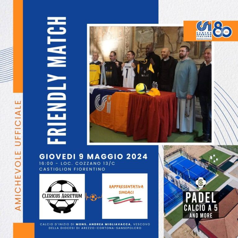 La partita vedrร  confrontarsi due compagini davvero speciali: da un lato la Rappresentativa dei Sindaci, che fa il suo esordio ufficiale sul rettangolo verde e che vede nel ruolo di mister Alessandro Calori, e dallโ€™altro la Clericus Arretium, la rappresentativa di calcio a 5 del CSI di Arezzo in collaborazione con la Diocesi di Arezzo-Cortona-Sansepolcro, composta da sacerdoti del territorio e allenata da Mister Mario Palazzi.