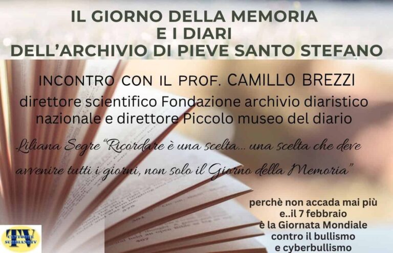 Il prof. Camillo Brezzi, direttore scientifico della Fondazione archivistica dei diari di Pieve Santo Stefano sarà a Subbiano nella sala consiliare venerdì 7 febbraio alle ore 17 per delle “Riflessioni” sul Giorno della Memoria e sul valore dei diari presenti nell’archivio nazionale di Pieve Santo Stefano , un incontro organizzato dall’Amministrazione Comunale.