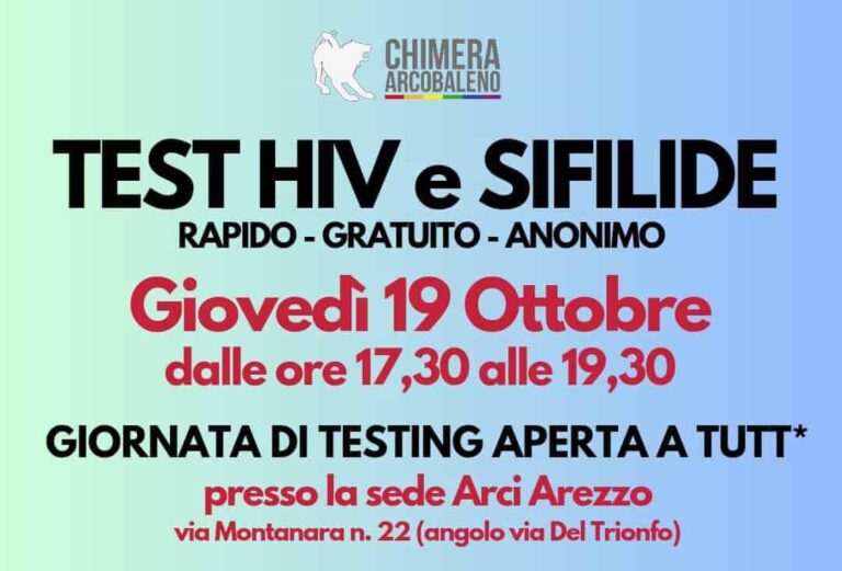 Giovedì 19 Ottobre tra le ore 17.30 e le ore 19.30 presso la sede di Arci Arezzo (via Montanara n. 22 – angolo con via del Trionfo) tornano la prevenzione, informazione e screening sulle Infezioni Sessualmente Trasmissibili promosse dal comitato Arcigay Arezzo Chimera Arcobaleno in collaborazione con il personale sanitario Asl dell’UOC Malattie Infettive.