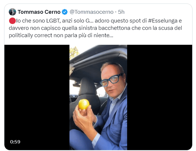 “Io che sono LGBT, anzi solo G… adoro questo spot di #Esselunga e davvero non capisco quella sinistra bacchettona che con la scusa del politically correct non parla più di niente” afferma Tommaso Cerno, già senatore della Repubblica e oggi direttore del quotidiano l’Identità.