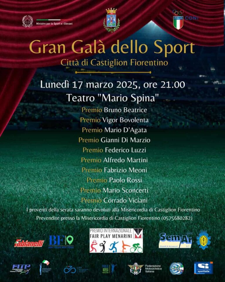 E’ questa, in sintesi, l’essenza del “Gran Galà dello Sport Città di Castiglion Fiorentino”, manifestazione benefica istituita dal Comune di Castiglion Fiorentino nel 2016 che, negli anni, si è via via arricchita e ampliata, e che ritorna lunedì 17 marzo alle ore 21 al Teatro Spina.
