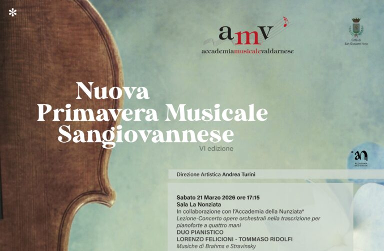 Con la primavera riparte infatti la rassegna “Nuova primavera musicale sangiovannese”, organizzata dall’Accademia musicale valdarnese sotto la direzione artistica del maestro Andrea Turini e con il patrocinio del Comune di San Giovanni Valdarno. Giunta alla sua sesta edizione, la manifestazione propone un percorso musicale articolato in cinque concerti, in programma tra marzo e giugno nella suggestiva sala La Nonziata, confermandosi come un’importante occasione di incontro tra pubblico, giovani interpreti e artisti di consolidata esperienza.