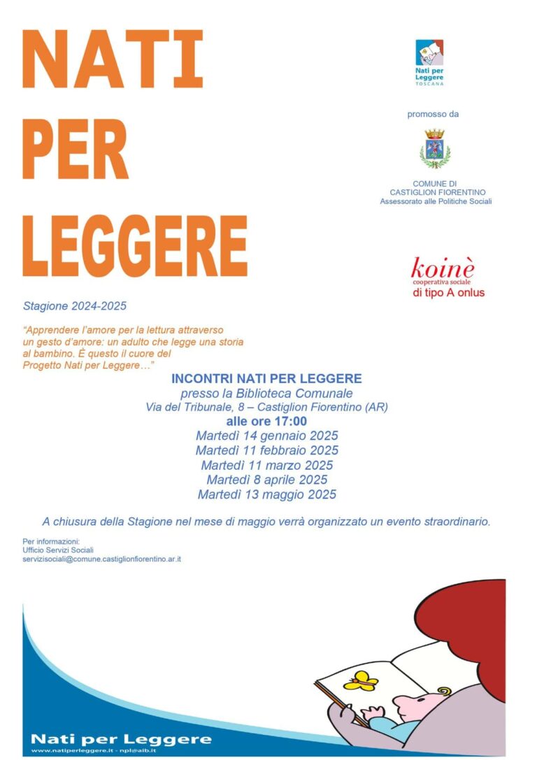 Anche quest’anno l’assessorato alle Politiche Sociali di Castiglion Fiorentino propone e promuove il progetto “Nati per Leggere” che, come di consueto, si svolgerà presso la Biblioteca comunale.