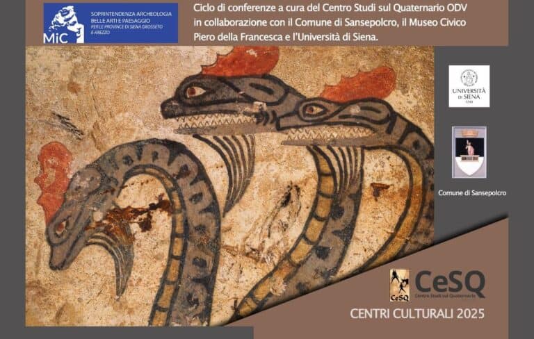 Tornano al Museo Civico di Sansepolcro gli appuntamenti dei Centri Culturali 2025, con il ciclo di incontri intitolato “Trame d’Etruria – Aggiornamenti, studi e nuove scoperte sugli Etruschi nel 2025”, a cura del Centro Studi sul Quaternario ODV (CeSQ) in collaborazione con il Comune di Sansepolcro, il Museo Civico Piero della Francesca e l’Università di Siena, con il patrocinio della Soprintendenza Archeologia, Belle Arti e Paesaggio per le province di Siena, Grosseto e Arezzo.