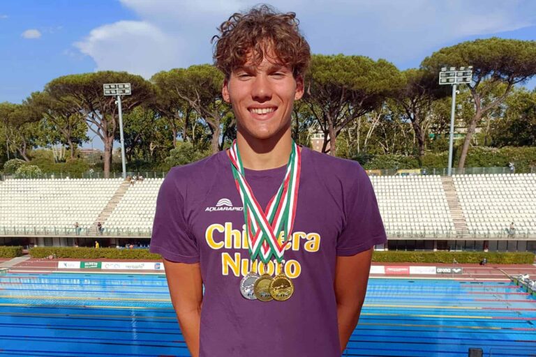 AREZZO – Gabriele Gambini entra nella storia del nuoto aretino. L’atleta della Chimera Nuoto, nato nel 2005, ha concluso i Campionati Italiani Cadetti al Foro Italico di Roma con la vittoria di un oro nei 200 stile libero, di un argento nei 400 stile libero e di un bronzo nei 200 misti, riuscendo a chiudere la più importante manifestazione giovanile della stagione con ben tre medaglie al collo su un totale di quattro gare disputate.
