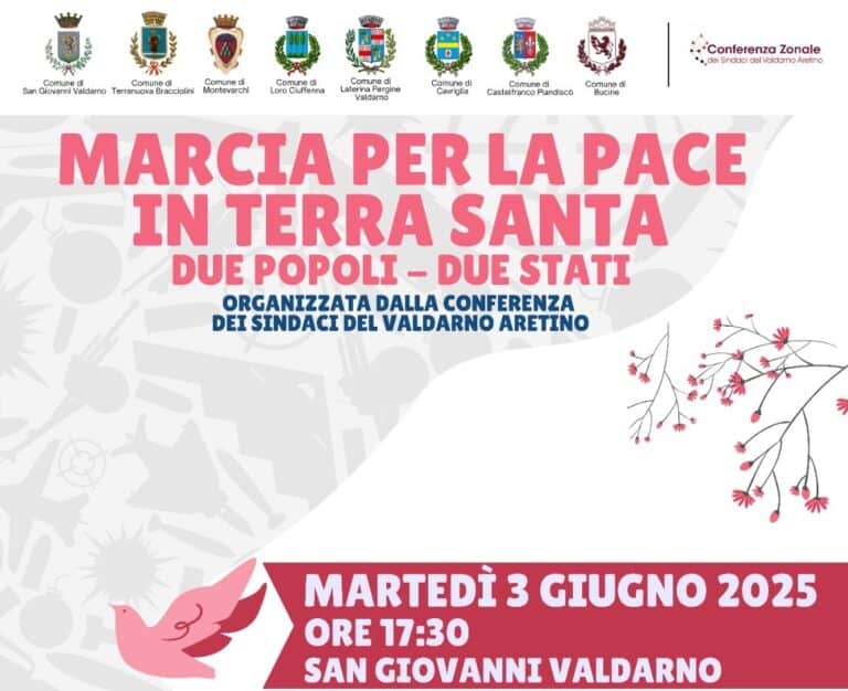 La Conferenza dei Sindaci del Valdarno Aretino ha organizzato per martedรฌ 3 giugno ore 17:30 a San Giovanni Valdarno la โMarcia per la Pace in Terra Santa. Due Popoli โ Due Statiโ.