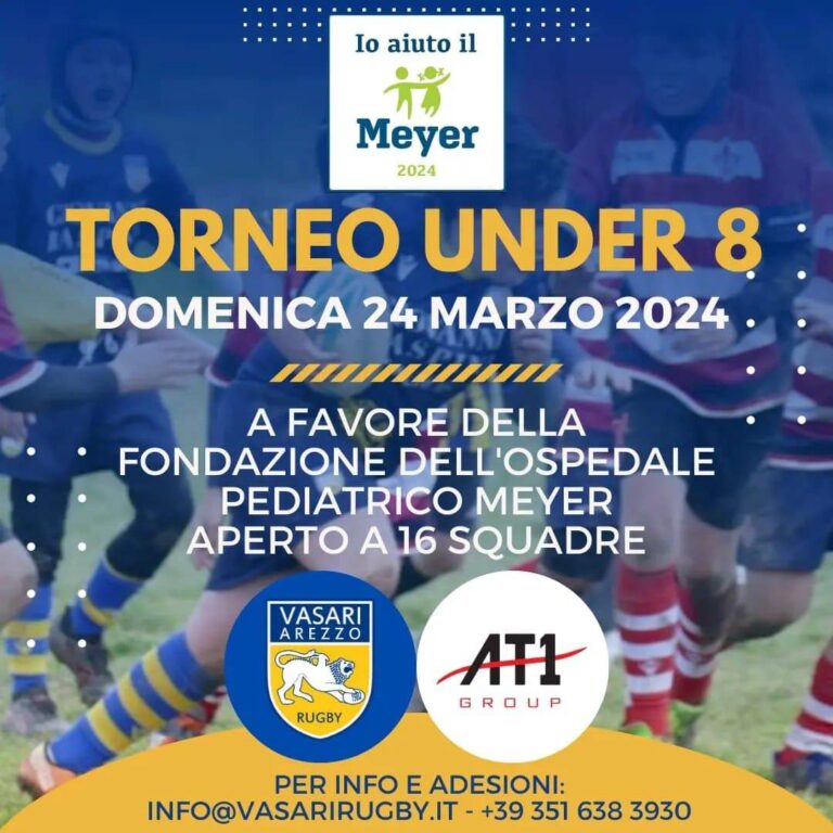 Domenica 24 marzo il Vasari Arezzo Rugby organizza, con la collaborazione dello studio di Architettura e Ingegneria AT1 Group, la seconda edizione del torneo di Rugby Under 8 a favore della Fondazione dell’Ospedale Pediatrico Meyer. Lโiniziativa vedrร coinvolte squadre formate da bambini sotto i nove anni che giocheranno insieme nella casa del Vasari Arezzo.