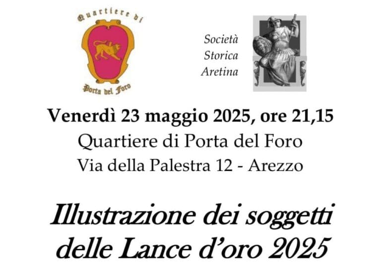 L’incontro, aperto alla cittadinanza, si concluderà con un dibattito al quale tutti gli intervenuti potranno partecipare. Presiederanno l’incontro il rettore del quartiere di Porta del Foro Roberto Felici e il presidente della Società Storica Aretina Luca Berti. Al termine della serata è prevista la visita al museo del quartiere giallocremisi.