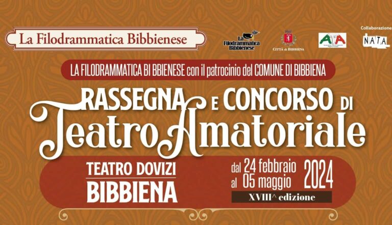 La Filodrammatica Bibbienese è lieta di presentare la XVIII edizione della Rassegna e Concorso teatrale per gruppi amatoriali, che torna dal 24 febbraio al 4 maggio dopo l’entusiasmo e il successo dell’edizione 2023, anno che ha segnato il ritorno nel magnifico scenario del Teatro Dovizi dopo la pausa dovuta alla pandemia.